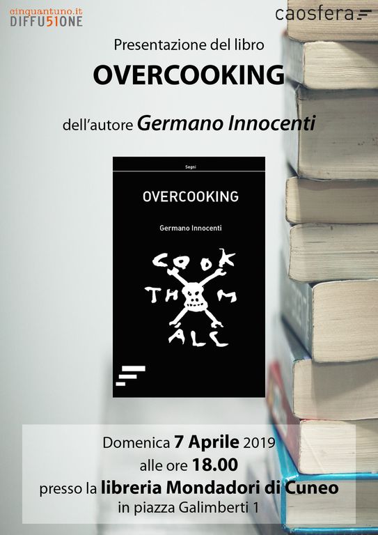 Domenica 7 aprile alle ore 18.00 presso la libreria Mondadori di Cuneo, lo scrittore e giornalista Germano Innocenti presenterà il suo ultimo libro Overcooking. Il testo, edito nel 2018 per i tipi di “Caosfera-edizioni”, raccoglie in silloge quasi tre anni di articoli dell'omonima rubrica Overcooking ad oggi in corso sul nostro quotidiano Targato CN, pubblicati ogni settimana.