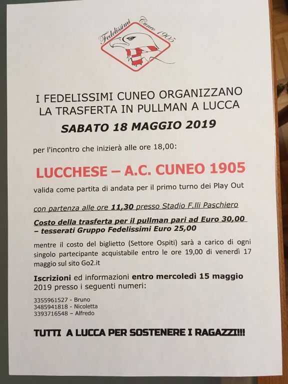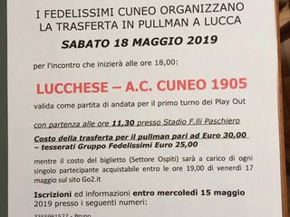 I sostenitori, nello specifico il gruppo "I Fedelissimi", stanno organizzando la trasferta di sabato 18 a Lucca. Partenza alle 11,30 al Paschiero ed iscrizioni da definire entro mercoledì 15 maggio (3355961527 Bruno, 3485941818 Nicoletta, 3393716548 Alfredo).