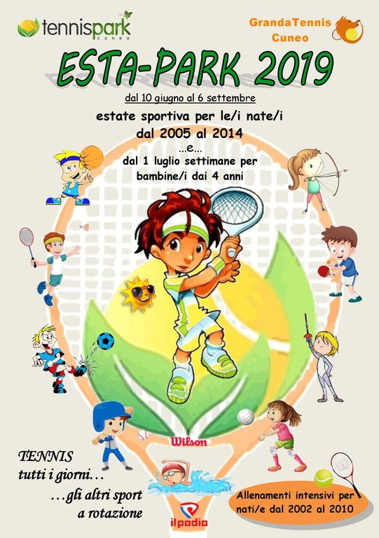 Al Tennis Park Cuneo di via Parco della Gioventù, 2 è tutto pronto per l'inizio dell'Esta-Park, un'estate sportiva ricca di novità e tanto divertimento. Gli iscritti potranno contare sugli istruttori di Grandatennis per svolgere una serie di attività sportive che spaziano dal tennis al beach-volley, dal nuoto alla pallapugno, dal basket al calcio, al judo, alla scherma, al rugby, a istruttori di madre lingua inglese e spagnolo e molto altro ancora.