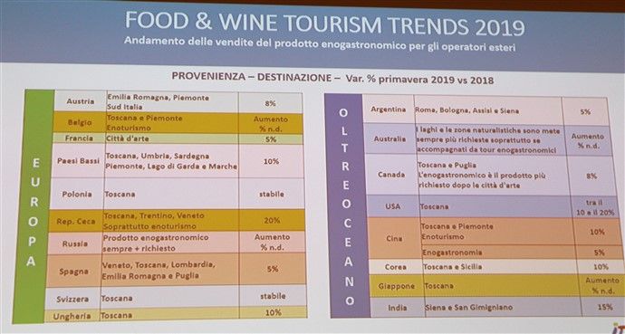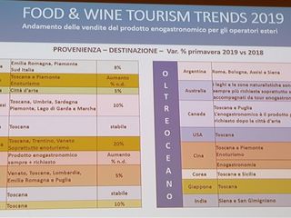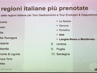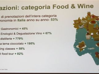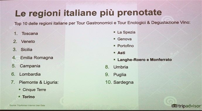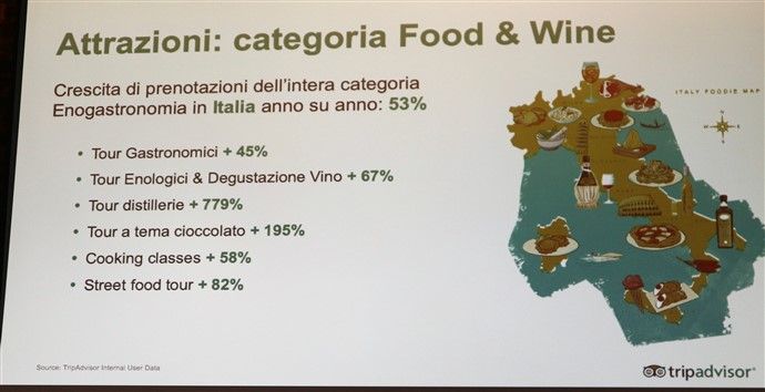 I dati diffusi ieri sono incoraggianti e segnalano la crescita del settore del turismo enogastronomico, e che il food&wine sia sempre più determinante nelle scelte turistiche lo confermano i dati di TripAdvisor, illustrati da Valentina Quattro, Associate director Italia: la crescita delle prenotazioni per tour enogastronomici è stata in un anno del 53%, e al top tra le mete ci sono Toscana, Veneto, Sicilia e ovviamente il Piemonte e le Langhe, che ospitano il forum. In un anno le prenotazioni per tour legati al cibo e ai vini hanno fatto registrare un incremento del 53% e le prenotazioni sono arrivate da Usa, Regno Unito e Australia, con l'Italia al sesto posto.