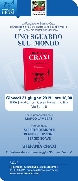 Si tratta dell'unica data piemontese della presentazione del libro "Uno Sguardo sul mondo" edito da Mondadori e tratto dagli appunti e dalle memorie di Bettino Craxi, prima nel suo ruolo di statista, poi di alto rappresentante presso l'ONU e poi ancora con riferimento dei suoi ultimi anni a Hammamet.