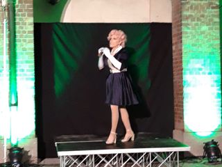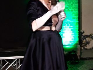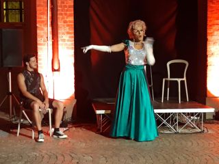 Riccardo Massidda smette per qualche ora i panni del circense (il pubblico di Mirabilia l’ha visto in scena al palo cinese in Minuetti, sempre del collettivo Fabbrica C) per trasformarsi nella conturbante Ava Hangar, soubrette di altri tempi, volutamente un po’ svampita, sempre ironica con se stessa e il suo pubblico. La sua figura ricorda un po’ Silva Coscina, con il suo fascino, un po’ Marisa Laurito, con la sua ironia pungente, la capacità di prendersi sempre in giro, di ridere di se stessi e della società senza mai offendere.