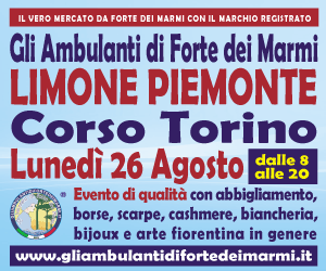 Esclusivo appuntamento con l’evento-mercato più famoso d’Italia. Ritorna infatti a grandissima richiesta a LIMONE PIEMONTE (Cuneo) l’eccellenza dell’unico vero ed originale mercato di qualità de "Gli Ambulanti di Forte dei Marmi". In uno speciale evento che ovunque attrae migliaia di visitatori, tutto il meglio del Made in Italy artigianale, niente cineserie di scarso pregio ed imitazioni, solo qualità garantita al prezzo migliore! Le notissime "boutique a cielo aperto" (come vengono ormai definite anche su stampa e TG nazionali) apriranno apriranno lunedì 26 agosto a LIMONE PIEMONTE (nella centrale location di Corso Torino) in collaborazione con la locale Pro Loco: dunque una giornata da non perdere assolutamente per le migliaia di fans dell’originale Consorzio della zona! Sarà come al solito la festa dello shopping più glamour e conveniente, con orario continuato, anche in caso di maltempo, dalle 8 alle 20.