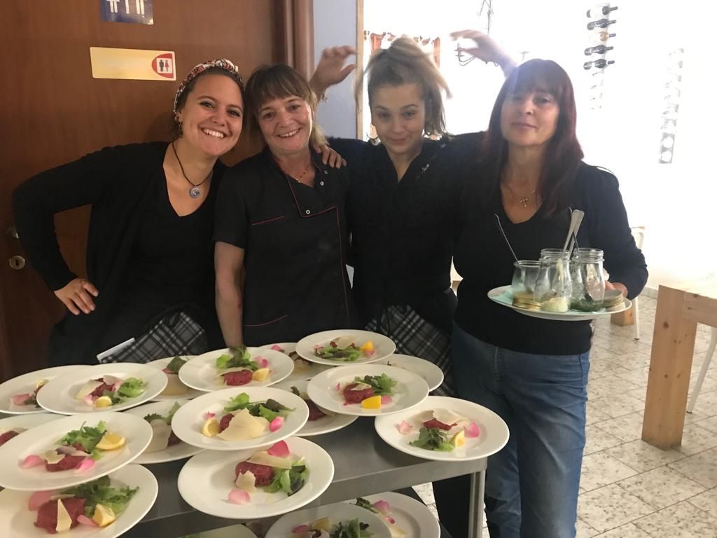 L’uno da 18 euro: Girello al punto rosa con salsa tonnata, Tortino di zucchine con fonduta di toma di Viso; Tagliolini porro e salsiccia; Spalla al forno alla birra con patate al rosmarino al forno; Sbriciolata di nocciole e crema gianduia; ¼ di vino o bibita e 1/2 d’acqua