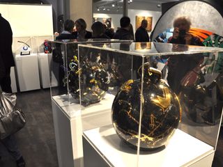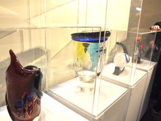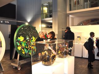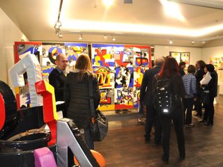 Così il numeroso pubblico che nel pomeriggio di ieri, venerdì 24 ottobre, ha voluto assistere alla vernice dell’allestimento inaugurato al piano terra di Palazzo Banca d’Alba (via Cavour 4) – e che nello stesso spazio sarà visitabile a partire da oggi, sabato 26, e al prossimo 12 gennaio –, ha potuto ammirare una varietà di opere che vanno dai coloratissimi quadri realizzati con la tecnica dell’intarsio ai vetri muranesi, passando per arazzi, ricami, maioliche dipinte, bronzi e sculture in poliuretano espanso, mentre una sezione è dedicata ai celebri "libri d’artista", altra originale produzione espressiva di un’autore il cui eclettismo ha probabilmente pochi pari nell’attuale panorama dell’arte internazionale.