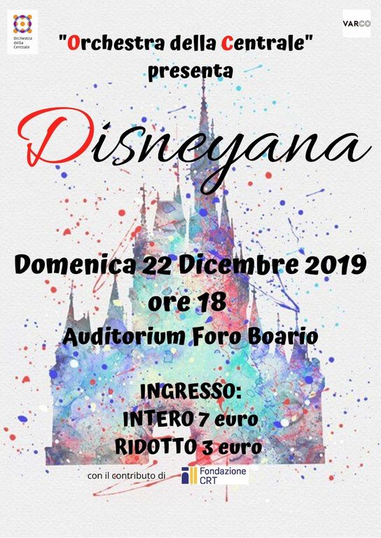 Il prossimo concerto è in programma domenica 22 dicembre alle 18, sempre all'Auditorium Foro Boario di Cuneo. Si tratta di un appuntamento pensato per le famiglie, in vista del Natale, con il sostegno della Fondazione CRT. L'Orchestra della Centrale si esibirà in “Disneyana”: un medley di colonne sonore tratte da alcuni film Disney, arrangiate da Fulvio Cioce (ex docente del Liceo Musicale “Ego Bianchi” di Cuneo), con letture recitate di Alfonso De Filippis che interagirà con i bambini nel pubblico. In scena compariranno i personaggi Disney delle opere eseguite in musica. Ci saranno, inoltre, delle proiezioni che permetteranno al pubblico di entrare nella magica atmosfera dei cartoni. Ingresso a pagamento (biglietto intero 7 euro e ridotto a 3 euro). I biglietti saranno in vendita presso la segreteria di Varco (Via Pascal 5L) a partire da lunedì 9 dicembre (dal lunedì al venerdì dalle 14.30 alle 18.30), sabato 21 dicembre (dalle 15 alle 18) e domenica 22 dicembre (dalle 15).