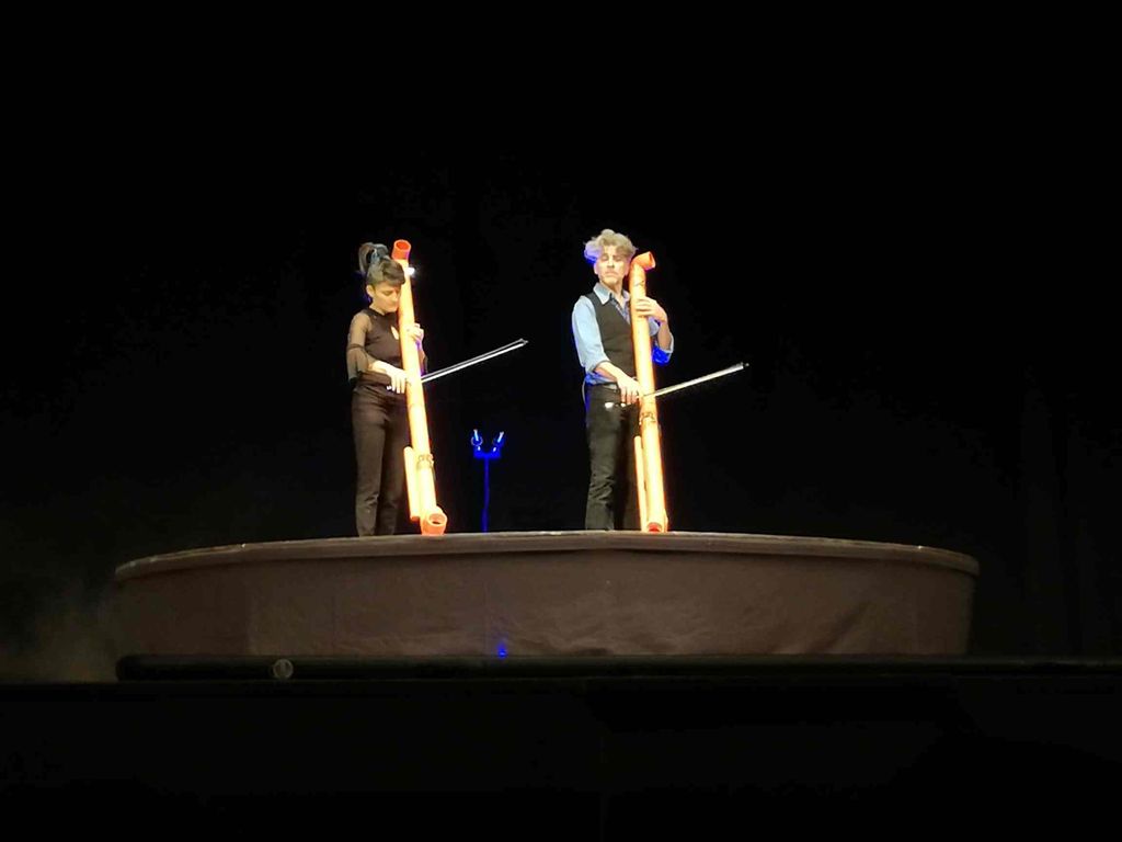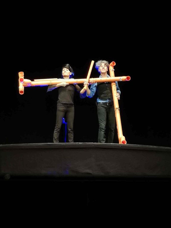 Sulla scena Maila Sparapani e Fernando d’Andria suonano qualunque oggetto, ma il denominatore comune è che abbiano come punto di partenza… Proprio un tubo, di quelli arancione da cantiere in plastica rigida che diventa basso tubo, tuboncello, tubiolino, mini-tubo, clavax (clava/sax), diabolofono (diabolo sonoro), Hula-Hop sonoro, e palo cinese sonoro. Lo stesso palco è trasformato in strumento musicale diventando la percussione di un concerto che è un excursus nella musica di tutti i generi ed epoche.