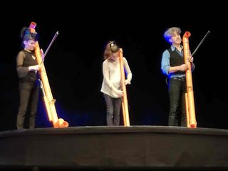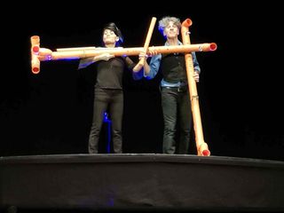 Sulla scena Maila Sparapani e Fernando d’Andria suonano qualunque oggetto, ma il denominatore comune è che abbiano come punto di partenza… Proprio un tubo, di quelli arancione da cantiere in plastica rigida che diventa basso tubo, tuboncello, tubiolino, mini-tubo, clavax (clava/sax), diabolofono (diabolo sonoro), Hula-Hop sonoro, e palo cinese sonoro. Lo stesso palco è trasformato in strumento musicale diventando la percussione di un concerto che è un excursus nella musica di tutti i generi ed epoche.