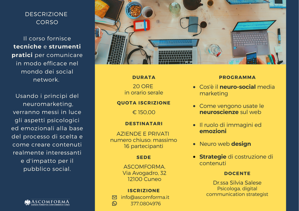 Usando i principi del neuromarketing, verranno messi in luce gli aspetti psicologici ed emozionali alla base del processo di scelta e come creare contenuti realmente interessanti e di impatto per il pubblico social.