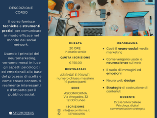 Usando i principi del neuromarketing, verranno messi in luce gli aspetti psicologici ed emozionali alla base del processo di scelta e come creare contenuti realmente interessanti e di impatto per il pubblico social.