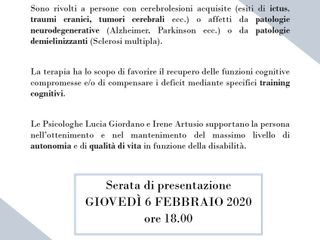 L’obiettivo della riabilitazione è quello di restituire autonomia e qualità di vita attraverso il recupero di funzioni complesse. Essa è rivolta a persone con esiti di ictus, traumi cranici, o affetti da patologie neurodegenerative (Alzheimer, Parkinson ecc.) oppure patologie demielinizzanti (Sclerosi multipla). Le Psicologhe Lucia Giordano e Irene Artusio propongono una serata informativa gratuita con lo scopo di chiarire meglio questi concetti; l'incontro si terrà giovedì 6 febbraio alle ore 18 presso lo Studio Synergía in Corso Nizza 18 a Cuneo.