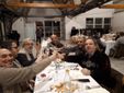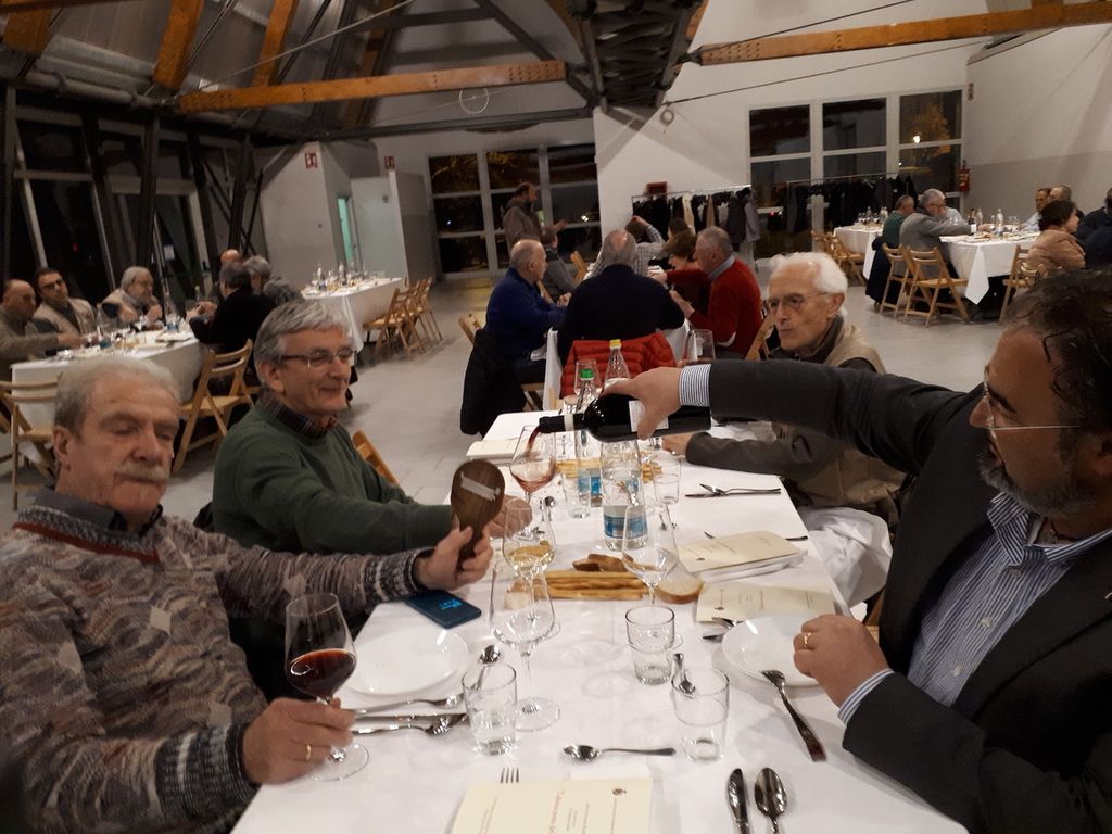 È seguita la cena con un menù al tartufo: carne cruda di fassone piemontese, fonduta di tartufi bianchi d'Alba Rocche del Roero, ovetto con tartufi bianchi d'Alba Rocche del Roero, arrosto di fassone piemontese con purè di patate, trittico di formaggi con albicocca e miele d'acacia, zabaione al Birbet con paste di meliga, torroncini Relanghe. Il tutto accompagnato dai vini Docg del Roero.