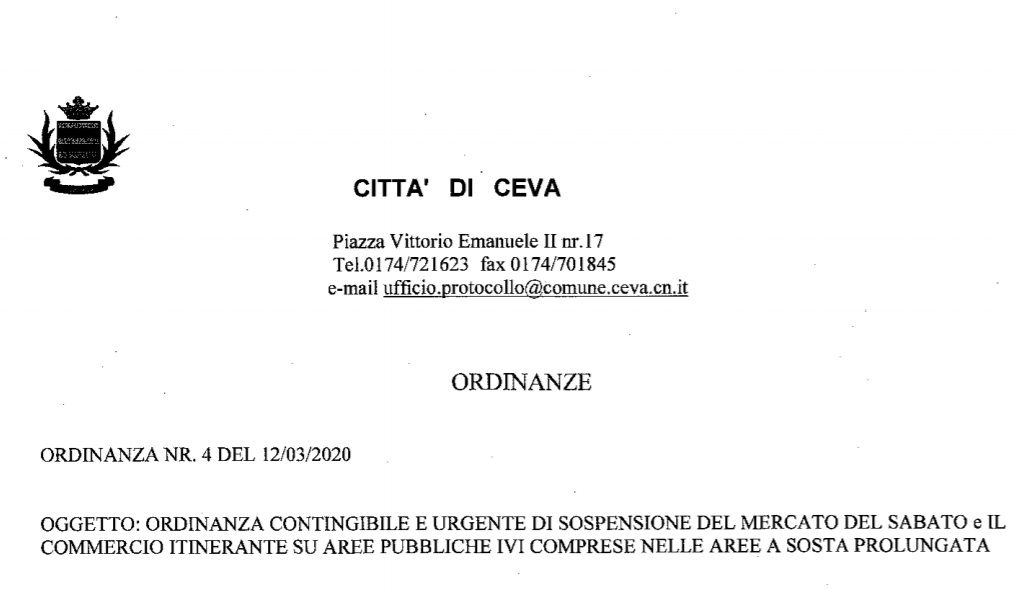 Ceva ha detto stop: niente mercati settimanali per due sabati (14 e 21 marzo) e niente vendita in forma itinerante nelle aree di sosta prolungata sino al 25 marzo.
