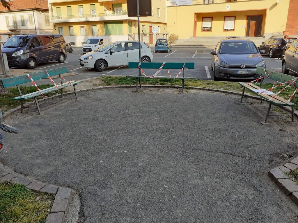 Panchine “fettucciate”, a Verzuolo, per evitarne l’utilizzo e, quindi, il possibile crearsi di assembramenti.