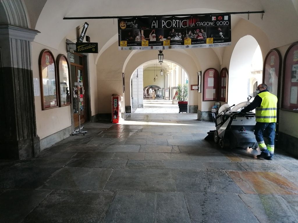 Anche sabato 28 febbraio a Fossano si è svolta la sanificazione dei portici e delle vie delle città, partendo dalla centrale via Roma.