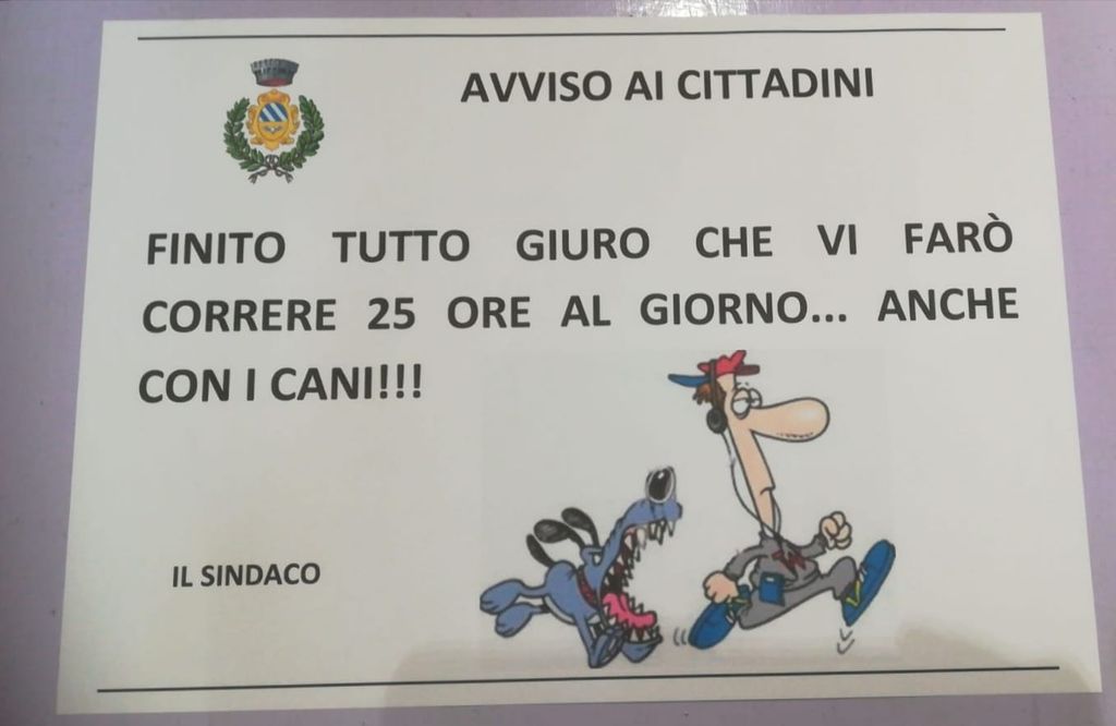 "Ho pensato che qualcosa fatto a vignetta valesse più di tante parole! - ha spiegato la sindaca Zucco - Ci sono “podisti” mai visti correre e cani che escono 10 volte al giorno!! È un avvertimento per fare stare a casa se vogliamo che tutto finisca prima dobbiamo essere attenti e rispettare le regole".