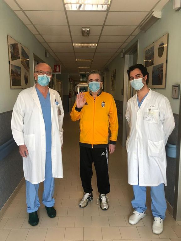 Mascherina in volto, si è fatto immortalare nei corridoi dell'ospedale di Cuneo in mezzo al primario Felice Borghi e al chirurgo Vincenzo Pruiti con la mano alzata in segno di saluto.