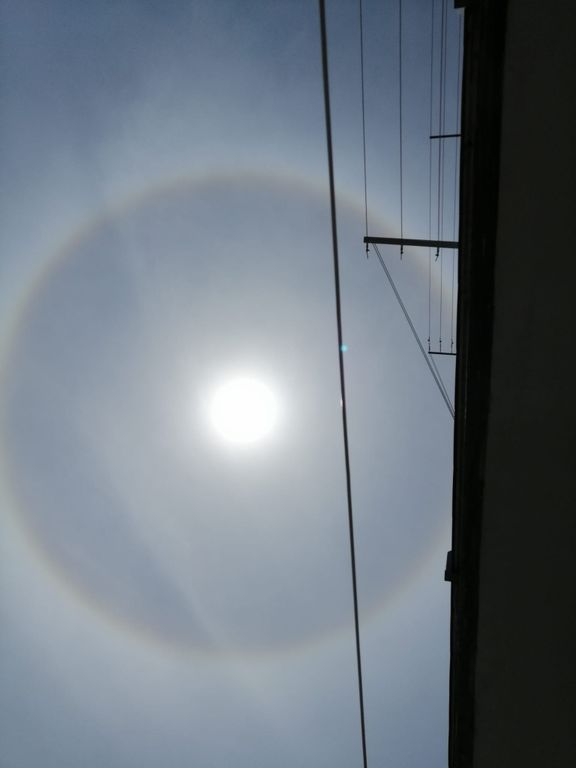 Il sole, infatti, intorno alle ore 13.30 si è manifestato con un raro fenomeno di rifrazione, il cosiddetto alone solare o cerchio solare.