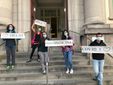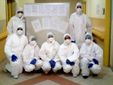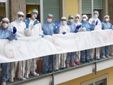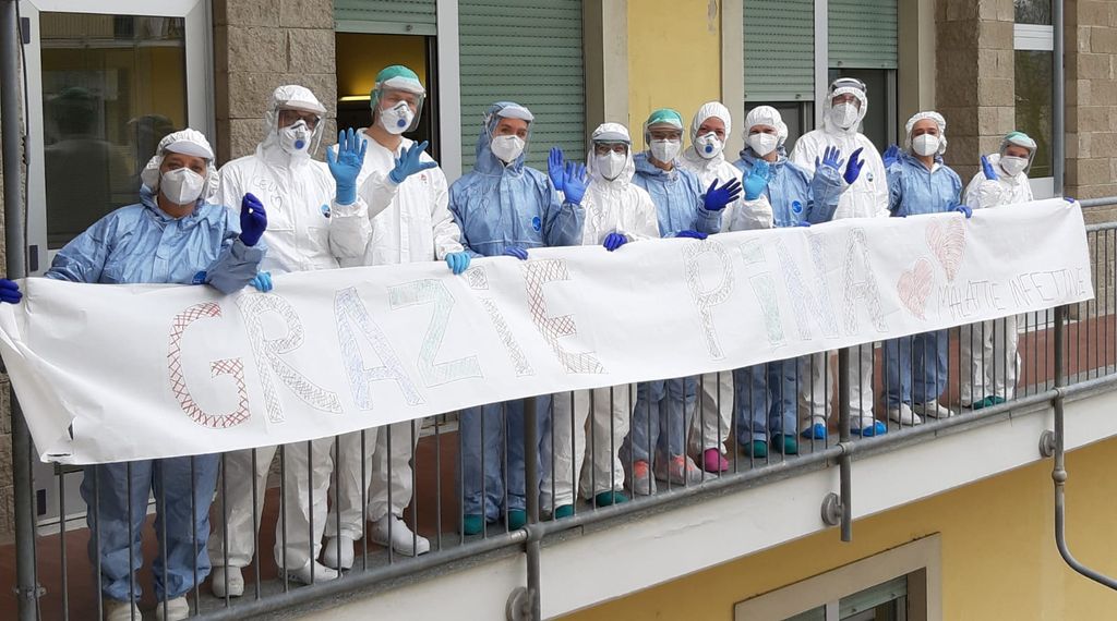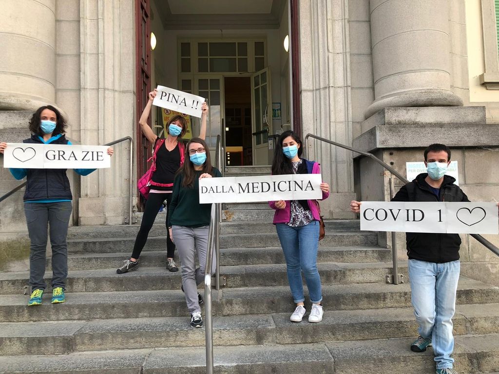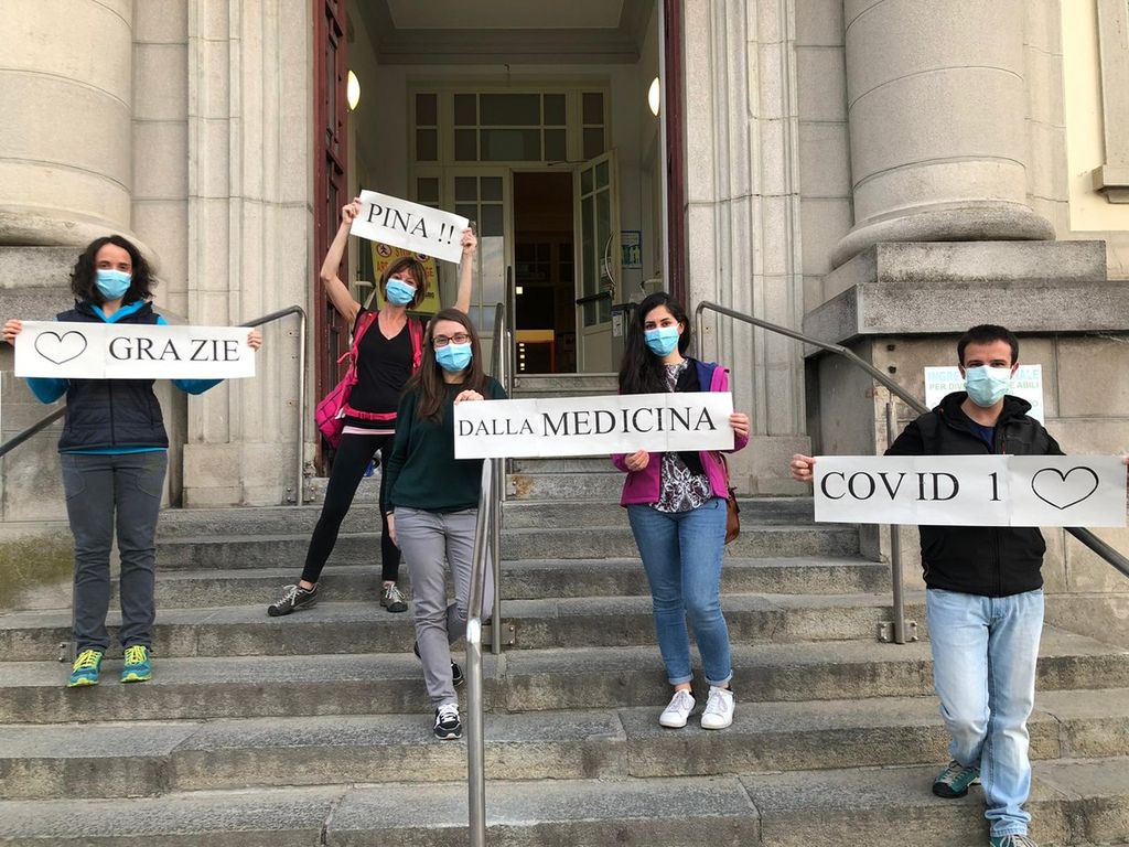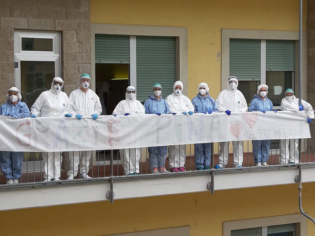 Uno accanto all’altro, tutti con indosso i presidi anti contagio, sulla scalinata dell’ospedale Carle, con in mano un cartello con scritto una parola molto semplice: “Grazie”.