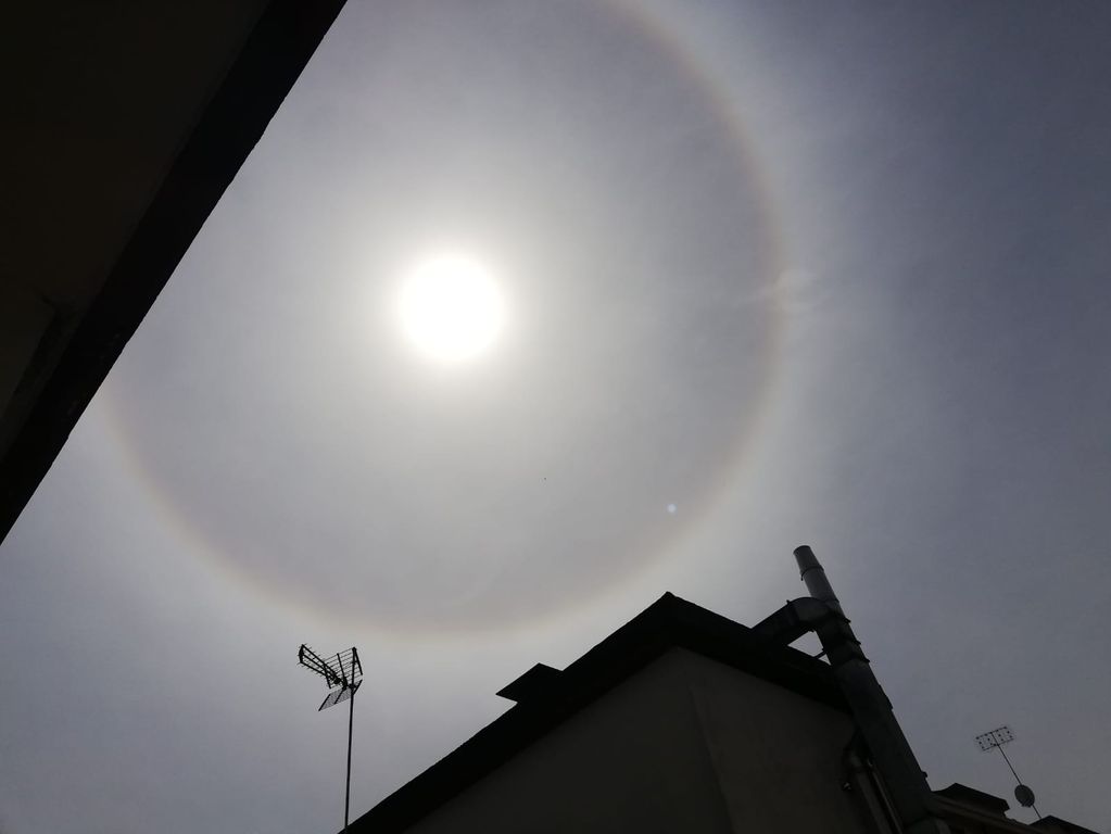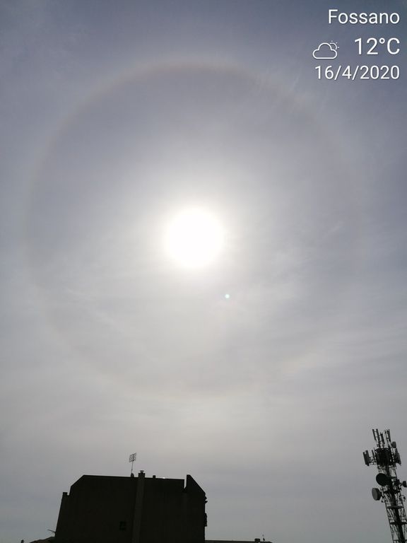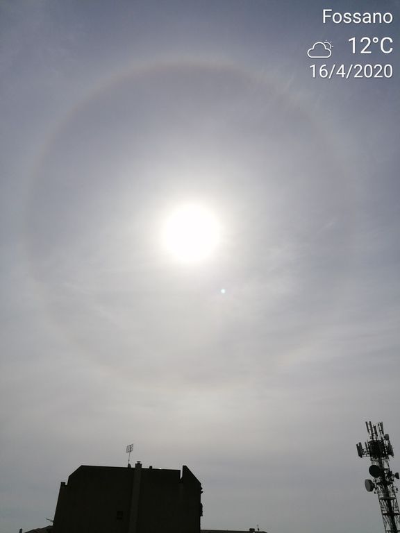 In molti l'hanno notato. Questa mattina, giovedì 16 aprile, il sole era contornato da un arcobaleno circolare. Ci sono arrivate diverse foto da lettori di Cuneo, Borgo San Dalmazzo e Fossano.