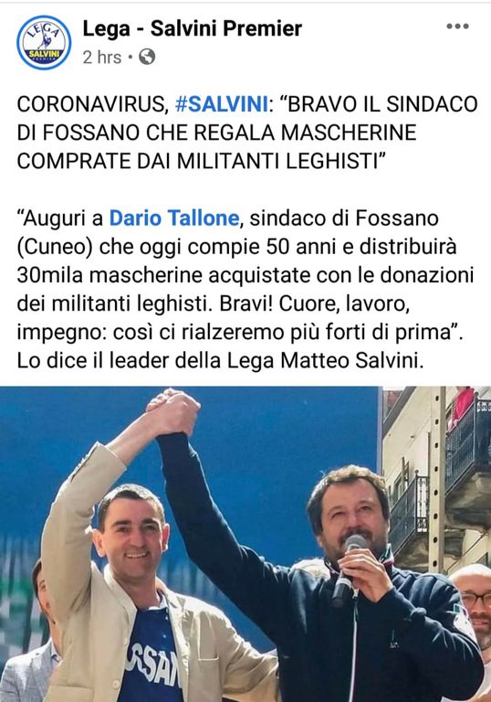 Nel post, infatti, si legge: "Bravo il sindaco di Fossano che regala mascherine comprate dai militanti leghisti".
