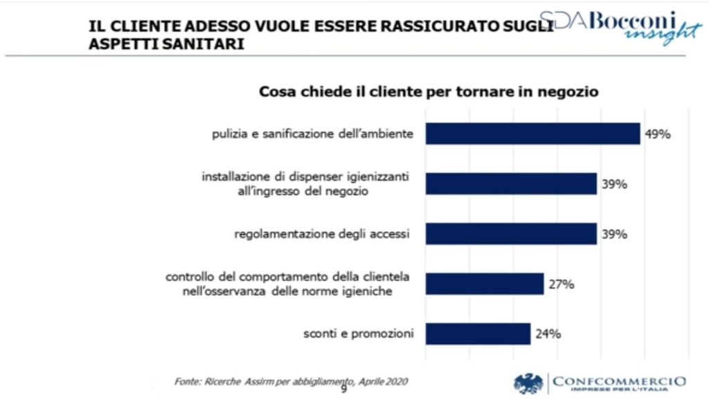 Il cliente ora ha bisogno di essere rassicurato sugli aspetti sanitari. Da un’indagine di Confcommercio per Sda Bocconi di fronte alla domanda “cosa chiede il cliente per tornare in negozio, per prenotare al ristorante o una vacanza in una struttura alberghiera” la risposta è stata così distribuita: per il 49% pulizia e sanificazione dell’ambiente, il 39% installazione di dispenser igienizzanti e regolamentazione degli accessi, 27% controllo del comportamento della clientela bell’osservanza delle norme igieniche, 24% sconti e promozioni.