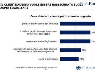 Il cliente ora ha bisogno di essere rassicurato sugli aspetti sanitari. Da un’indagine di Confcommercio per Sda Bocconi di fronte alla domanda “cosa chiede il cliente per tornare in negozio, per prenotare al ristorante o una vacanza in una struttura alberghiera” la risposta è stata così distribuita: per il 49% pulizia e sanificazione dell’ambiente, il 39% installazione di dispenser igienizzanti e regolamentazione degli accessi, 27% controllo del comportamento della clientela bell’osservanza delle norme igieniche, 24% sconti e promozioni.