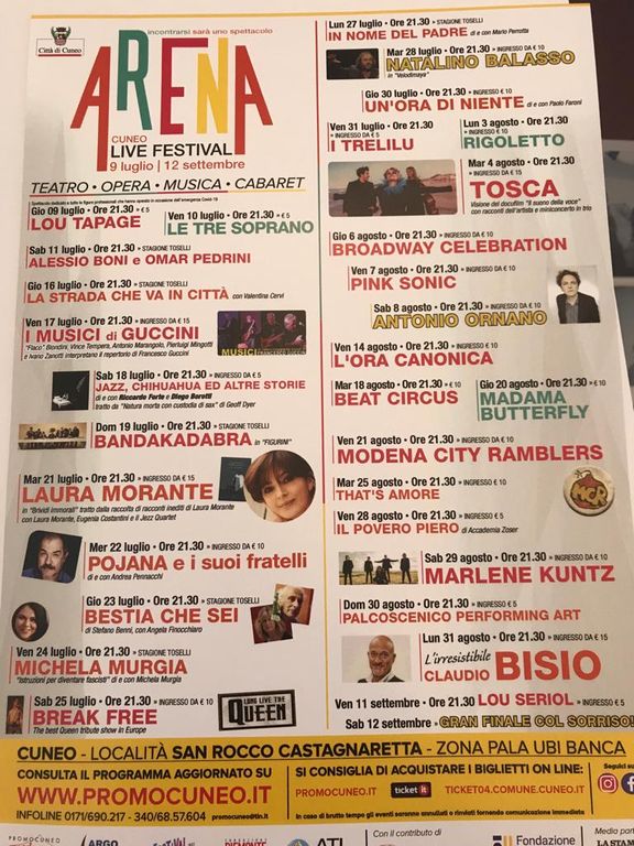 In cartellone, dal 9 luglio al 12 settembre, Michela Murgia, Laura Morante, Claudio Bisio, Marlene Kuntz, Modena City Ramblers e tanti altri. Sì parte con i Lou Tapage, spettacolo a 1 euro, il ricavato sarà devoluto a chi ha combattuto in prima linea durante l’emergenza, passando attraverso la Fondazione Crc perché, come ha evidenziato il presidente Genta, “così facendo verrà raddoppiata da parte nostra la donazione”.