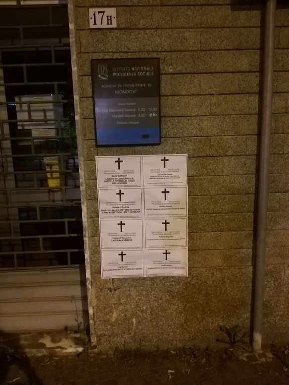 Centinaia di manifesti funebri sono stati affissi dai militanti di CasaPound Italia davanti alle sedi INPS in decine di città italiane, tra cui Cuneo, Saluzzo, Bra, Alba e Mondovì. L'intento è denunciare la morte dell’economia italiana e di migliaia di piccoli e piccolissimi imprenditori, messi in ginocchio dalle politiche governative e “giustiziati” dai disservizi, dai ritardi e dall’incapacità di gestire i pochi aiuti statali da parte dell’Istituto Nazionale di Previdenza Sociale.