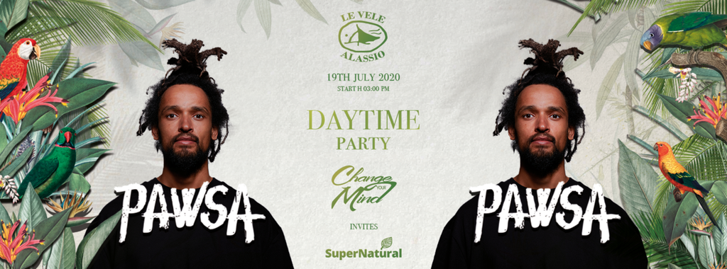 19th July 2020 Start H 03:00 PM LE VELE ALASSIO presents DAYTIME PARTY CHANGE YOUR MIND invites SUPERNATURAL w/ PAWSA TIME TABLE 15:00 > 18:00 - Francis Key 18:00 > 20:00 - Nicola Gavino 20:00 > ??? - Guest: PAWSA ??? > END - 100% Change Your Mind Soundsystem GREEN APERITIF 15:00 > 18:00 - Catering by Scola Restaurant of Castelbianco