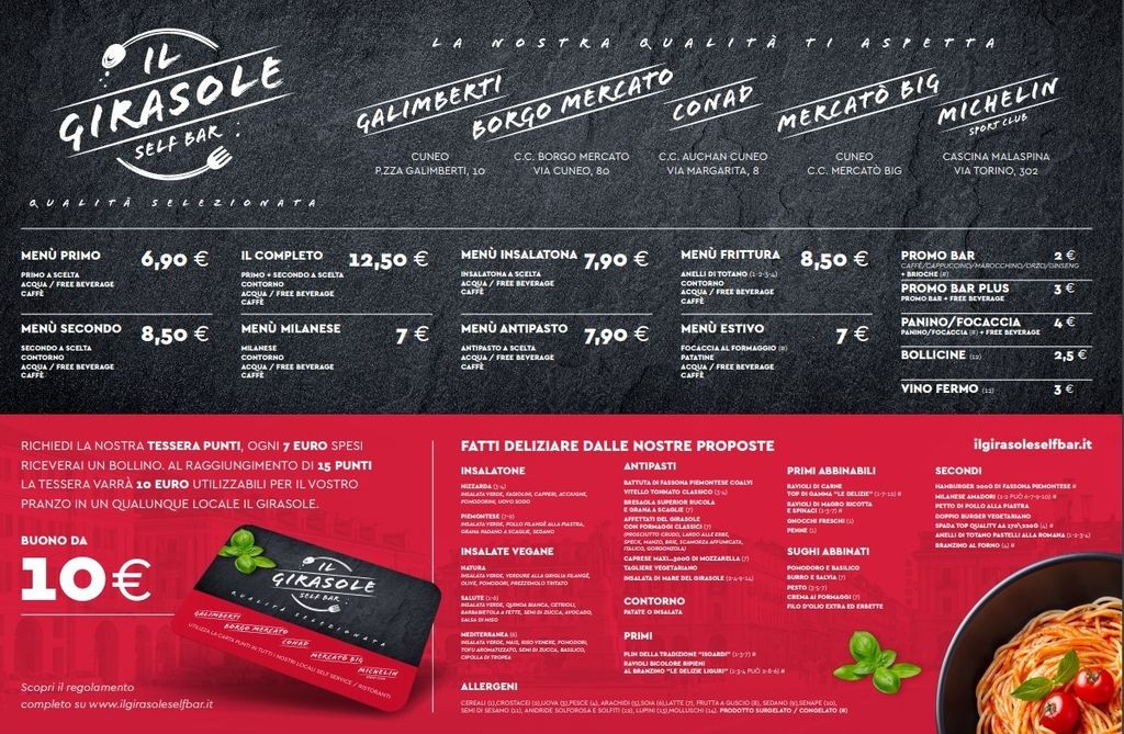 All’interno del Girasole Galimberti si potrà richiedere la tessera punti e ogni 7 euro spesi, il cliente riceverà un bollino. Al raggiungimento dei 15 punti, la tesserà varrà euro 10,00 utilizzabile per il proprio pranzo in un qualunque locale “Il Girasole” di Cuneo e Borgo San Dalmazzo.