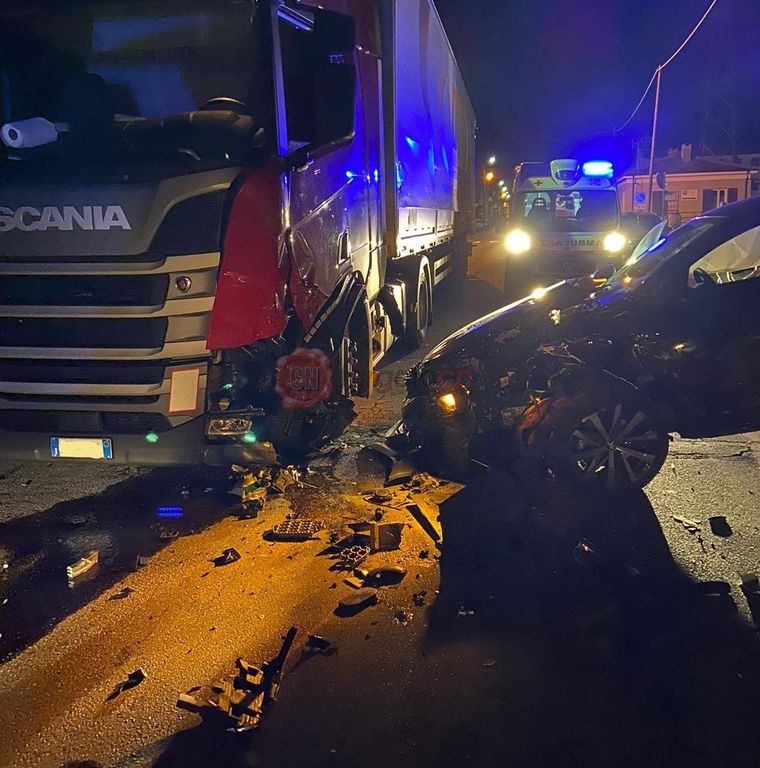 Scontro frontale tra Tir e auto, nella notte, a Paesana, in pieno centro paese.