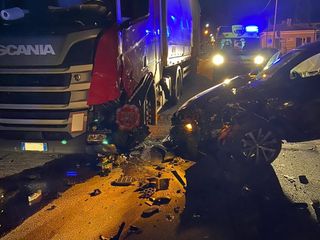 Scontro frontale tra Tir e auto, nella notte, a Paesana, in pieno centro paese.