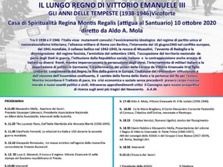 "Vittorio Emanuele III nella tempesta". E' il tema del 3° convegno di studi sul lungo regno di Vittorio Emanuele III (1900-1946) in programma a Vicoforte sabato 10 ottobre, dalle h.11 alle 19. Organizzato dalla Associazione di studi storici Giovanni Giolitti (ASSGG, Cavour) con il sostegno di vari Istituti ed Enti, esso avrà relatori Tito Lucrezio Rizzo (già Consigliere Capo Servizio del Quirinale), GianPaolo Ferraioli (Un. Campania), Gianpaolo Romanato (Un. Padova), Luca G. Manenti (Un.Trieste), il colonnello Carlo Cadorna, Aldo G. Ricci (Archivio Centrale dello Stato), il generale Antonio Zerrillo e Aldo A. Mola, coordinatore.
