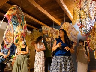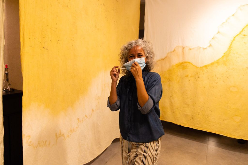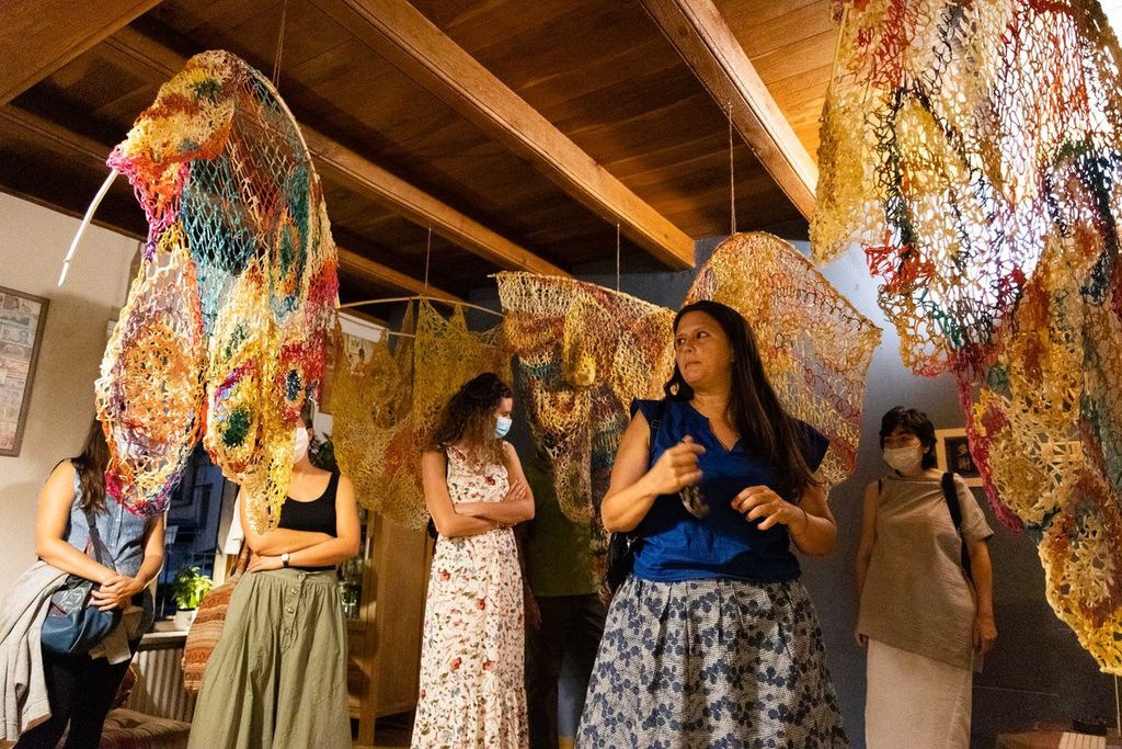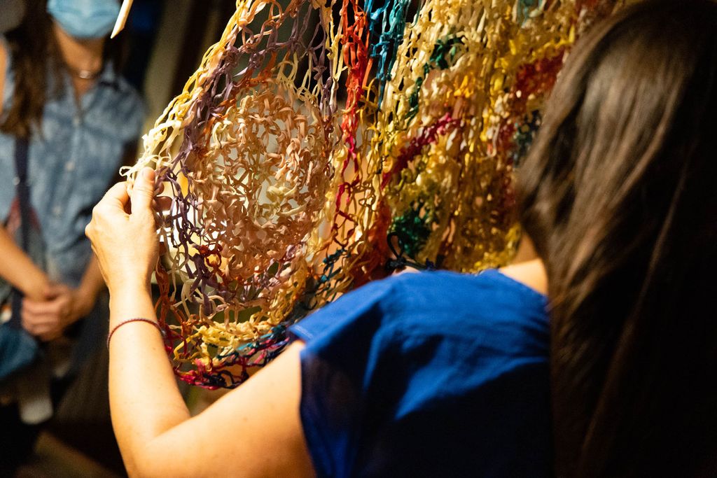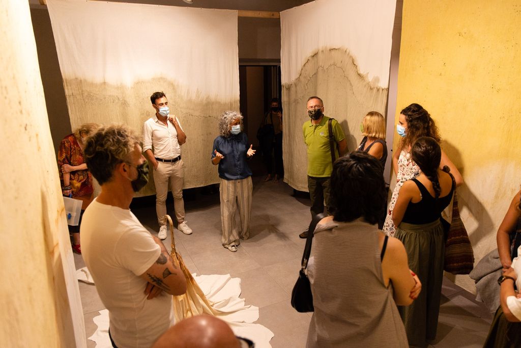 A casa La Dolcetta, Paola Anziché ha presentato l’opera “Sciami”. Il lavoro è nato dall’incontro tra l’attività artistica dell’artista e quella di apicoltore di Marco La Dolcetta. Affascinata dal complesso mondo delle api, Paola Anziché ha sfruttato l’esperienza della residenza come opportunità per sperimentare l’utilizzo di un nuova materia naturale. L’installazione, realizzata con trame di tessuto imbevute nella cera fusa, si presenta agli occhi dello spettatore come un organismo sospeso, simile a un alveare. L’opera, realizzata nei mesi recenti in una condizione di isolamento, ha avvicinato l’artista alla riscoperta delle qualità terapiche e delle virtù benefiche che una sostanza naturale come la cera d’api possiede. Il suo profumo trasmette calore e protezione, riequilibra, conforta e aiuta ad integrare armoniosamente gli aspetti contrastanti della personalità. È a partire da questa consapevolezza che Paola Anziché ripropone l’esperienza vissuta in prima persona allo spettatore, il quale, accolto tra le maglie del lavoro, è chiamato a interrogarsi sul potere curativo della natura, sui concetti di mescolanza, di empatia e di simbiosi con altre specie.