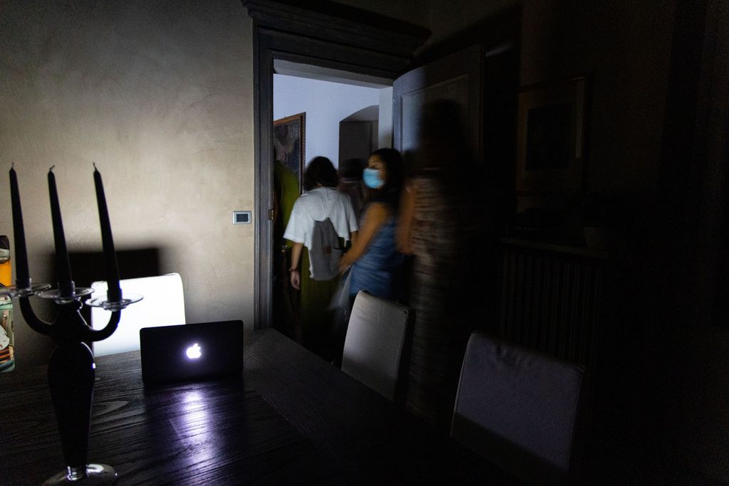 L’intervento che Andrea Nacciarriti ha concepito per l’abitazione della famiglia Dogliani, infine, analizza invece il senso di protezione che associamo a un luogo come la nostra casa, malgrado l’irrimediabile fragilità e precarietà a cui, con essa, siamo inevitabilmente sottoposti. L’artista ha approcciato lo spazio domestico annichilendolo, oscurandolo, in qualche modo bloccandone le sue funzioni organiche. Da luogo sicuro, intimo e accogliente per eccellenza, il contesto abitativo si è trasformato in un ambiente statico, immerso in una bolla atemporale che è in grado di farlo apparire inanimato, in una condizione di sospensione e di vulnerabilità, in bilico tra esterno e interno, tra prima e dopo. Una serie di dispositivi video (TV, laptop, computer), installati all’interno di uno spazio quasi totalmente buio, trasmettono un’immagine fissa di colore bianco, mentre un countdown segna il tempo che manca al termine dell’esposizione. All’esterno dell’abitazione, rami di arbusti e di alberi straripano dal montacarichi, offrendo un’immagine spiazzante e provocante. Una sorta di “natura morta” invade la dimensione privata, ricordando l’incursione del presente nelle nostre vite; una metafora della relazione tra naturale e artificiale, tra Cultura e Natura, tra selvaggio e domestico.