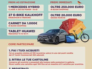 Oltre a questo, è prevista una estrazione finale, con premi orientati al green ed alla sostenibilità, in linea con la mission IGD: una Mercedes Classe A 250 Ibrida EQ Power, 27 e-bike Kalkhoff, 54 Carnet da 1.000 euro in buoni shopping da spendere nei negozi della Galleria Commerciale e 81 tablet Huawei.