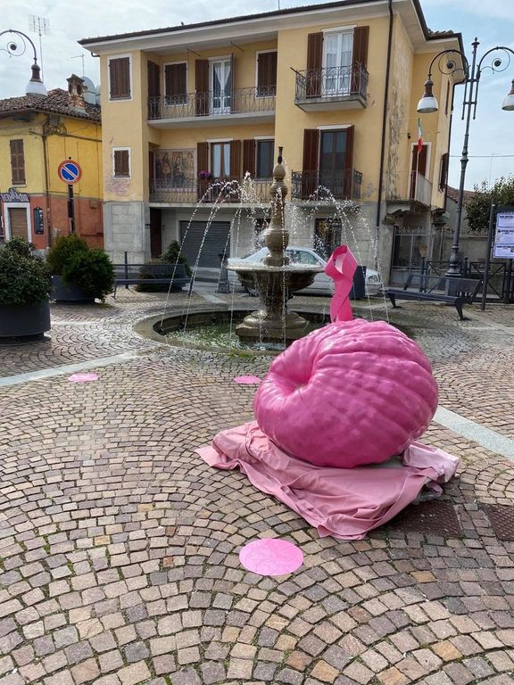 “Avendo avuto in prima persona un tumore al seno mi sento molto vicina a questa campagna” - spiega Anna Tognella – “In giro vedevo i monumenti illuminati in rosa, ma Piozzo (dove vivo) è conosciuta soprattutto per la zucca e quindi ho pensato di far verniciare una zucca di rosa”.