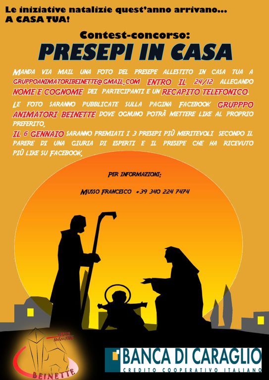 Il Gruppo animatori di Beinette non si ferma! Come anticipato nelle scorse settimane quest'anno, a causa delle restrizioni per il contenimento del covid, non si terrà il tradizionale concorso "Presepe in Crusà", ma gli animatori, con il sostegno della banca di Caraglio, organizzano due fantasiosi contest natalizi: uno dedicato alle decorazioni esterne delle abitazioni e uno sui presepi.