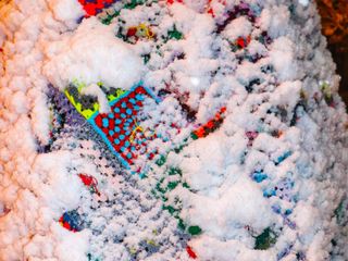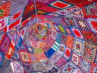 1800 “quadratini” di lana di 15 centimetri di larghezza. Che, in totale, compongono una “maxi pezza” di 40,5 metri quadrati.