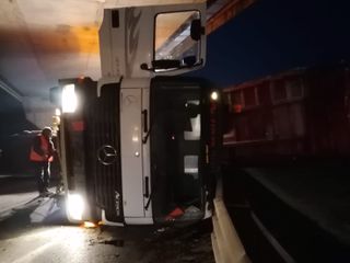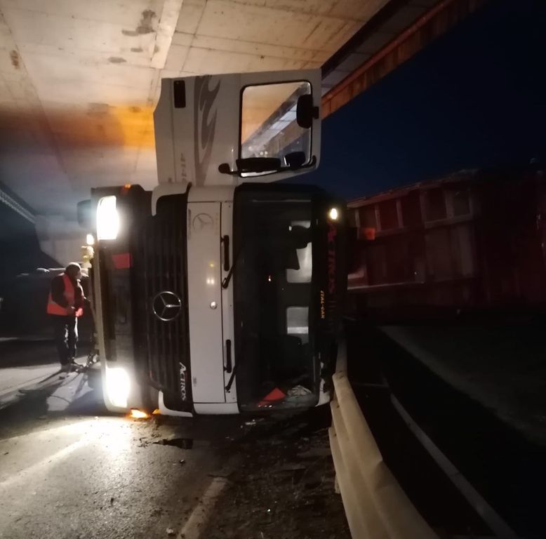 Intervento dei vigili del fuoco di Alba per la messa in sicurezza di un mezzo pesante che si è cappottato sulla Statale 231, appena oltrepassato il ponte del Tanaro, nella tratto attraversato dall''autostrada Asti-Cuneo.