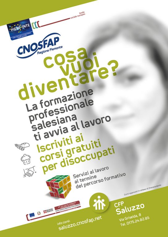 Al CNOS Fap (Centro nazionale opere Salesiane) di Saluzzo, in via Griselda 8 sono aperte le iscrizioni a due corsi pomeridiano/serali aperti a disoccupati maggiorenni; i corsi, entrambi da 600 ore con 240 ore di stage in azienda, rilasciano la Qualifica professionale e sono gratuiti perché finanziati dalla Regione Piemonte e dal Fondo Sociale Europeo.