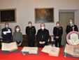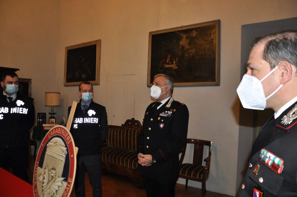 Stamattina la riconsegna dei volumi trafugati nelle mani del vescovo di Alba, monsignor Brunetti, al centro nella foto. Alla sua destra, il Comande provinciale dei Carabinieri, colonnello Pasquale Del Gaudio; alla sua sinistra il Comandante del Nucleo Tpc di Torino, tenente colonello Silvio Mele, e il Comandante della Compagnia Carabinieri di Alba, capitano Giovanni Ronchi
