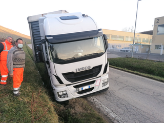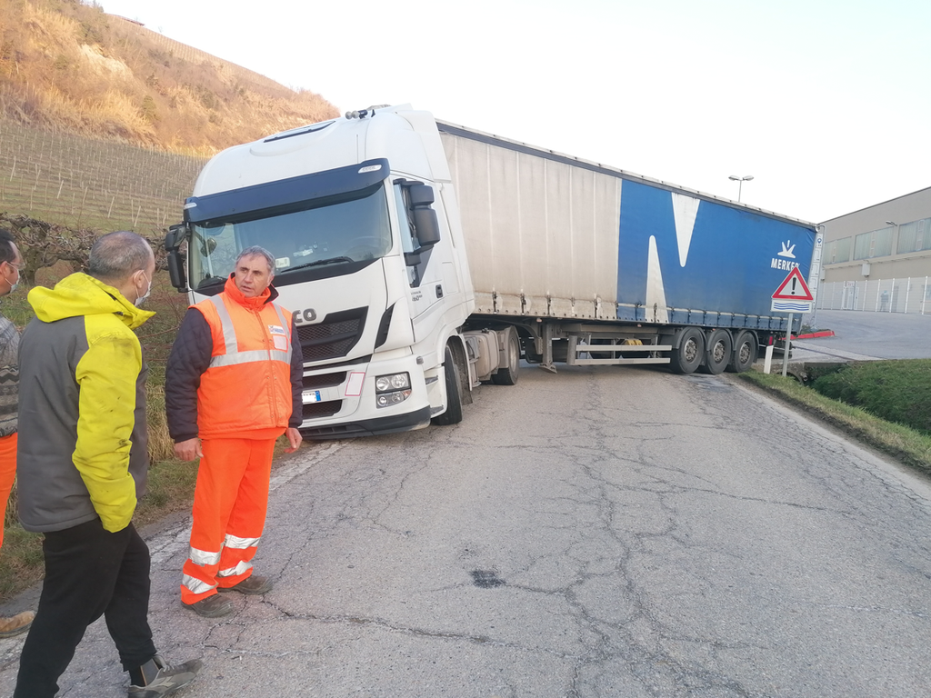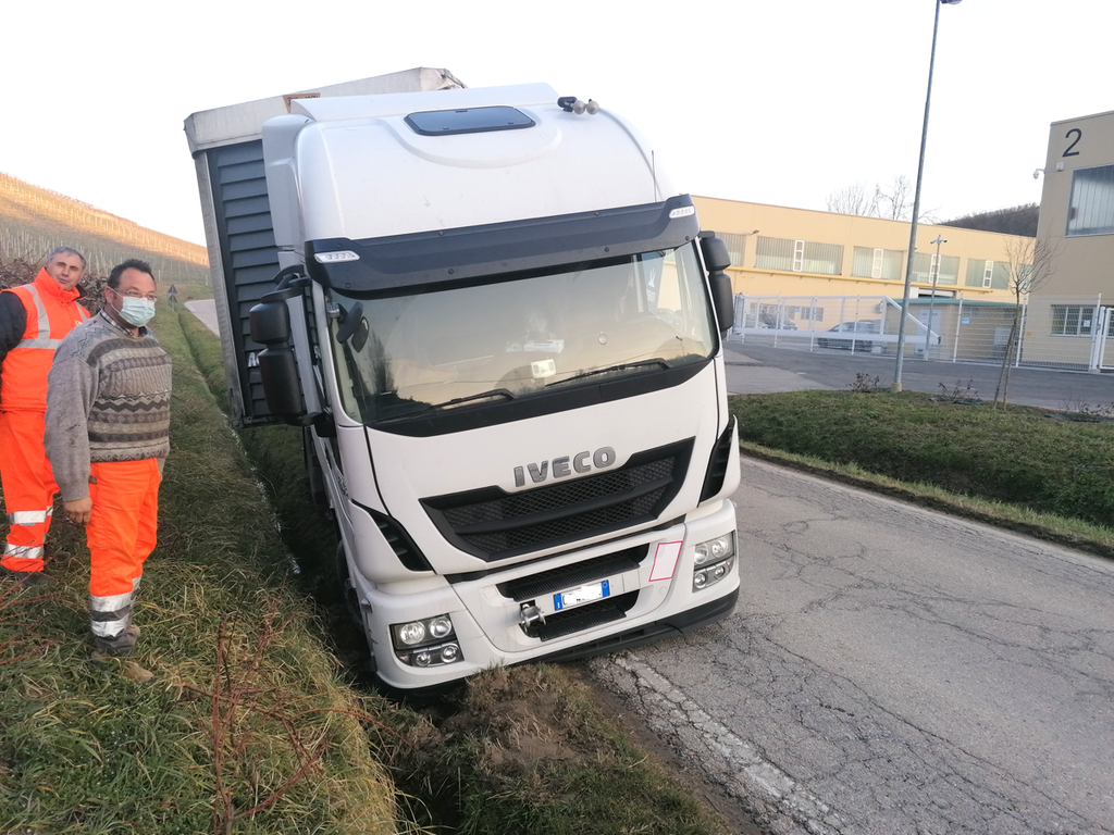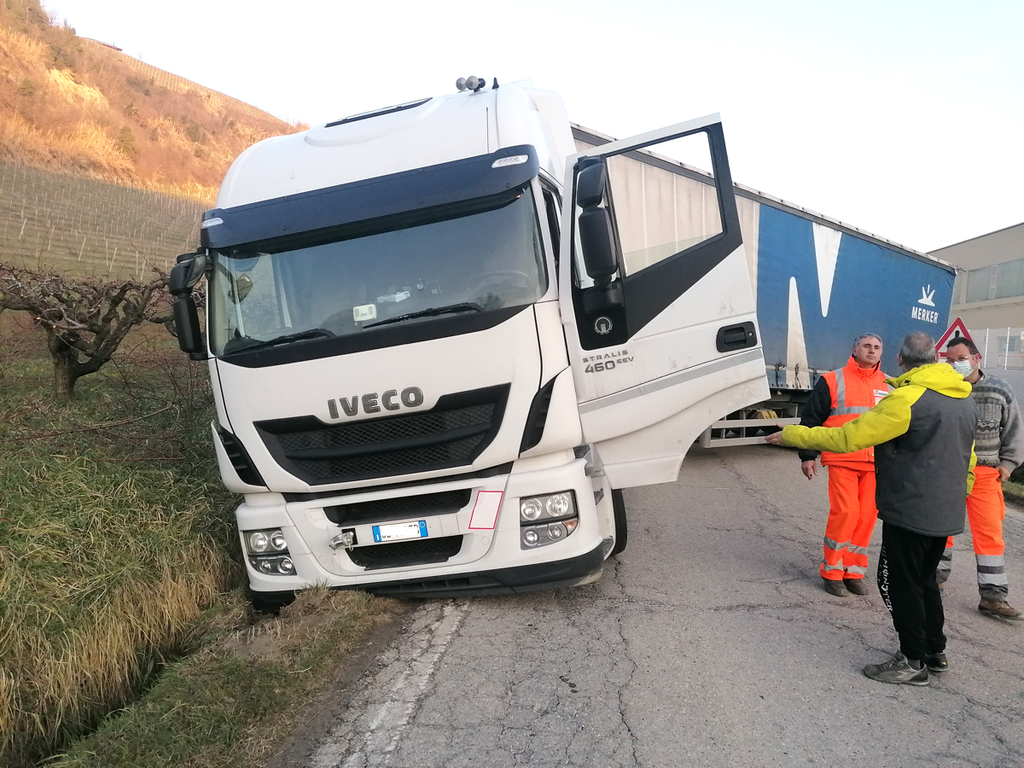 E’ tuttora interrotto il tratto della strada provinciale che corre ai piedi della zona artigianale di Castellinaldo, tra Borbore di Vezza d’Alba e il bivio per Castagnito, dove un autoarticolato in uscita da uno stabilimento è finito con le ruote anteriori della nel fosso che costeggia la strada.