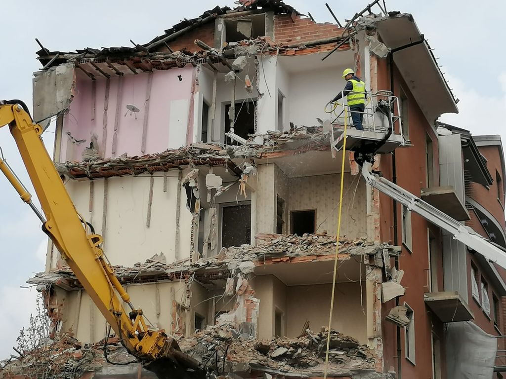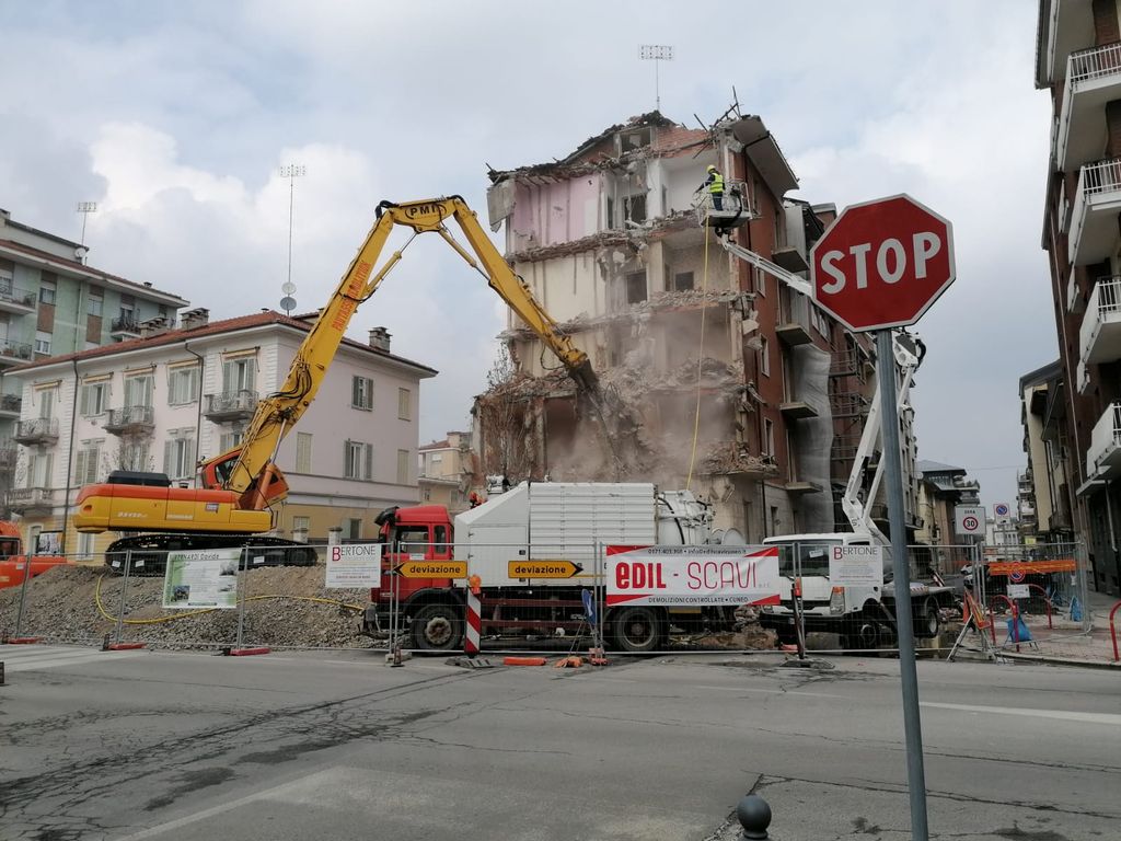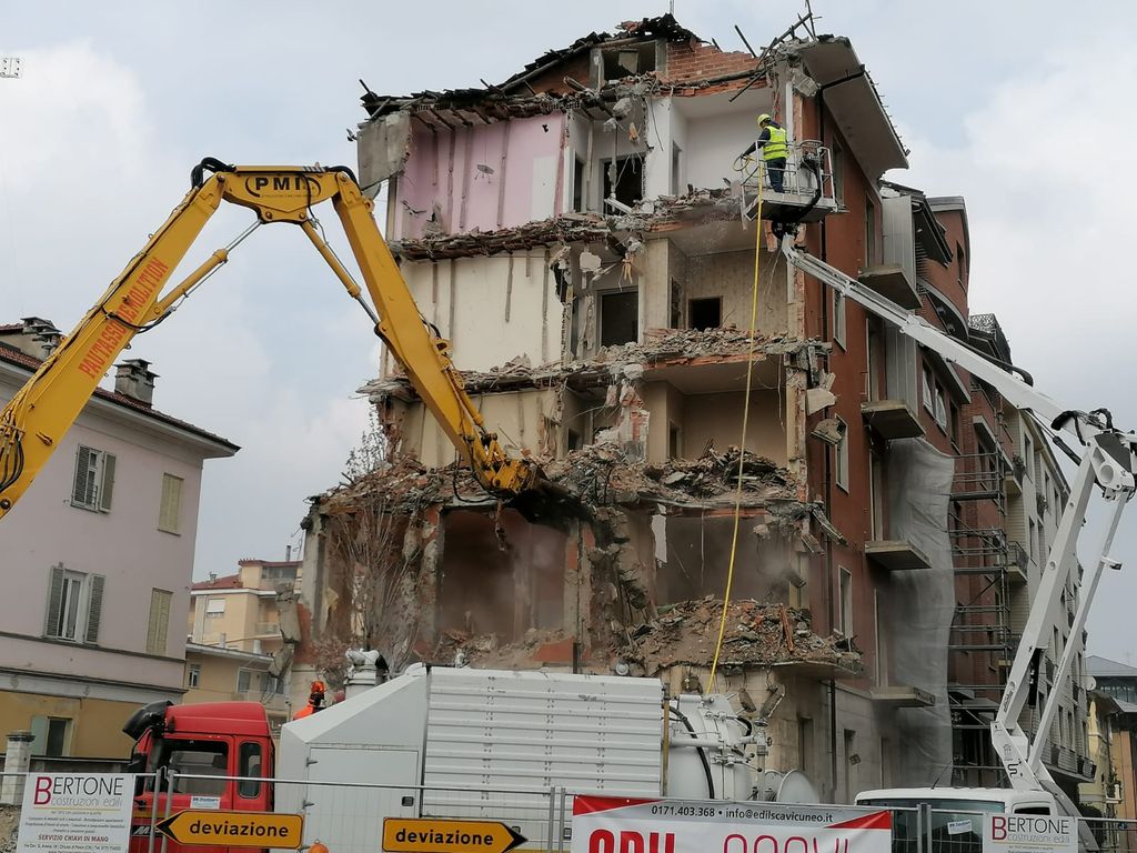 E' attualmente in corso a Cuneo la demolizione del palazzo all'angolo tra corso Brunet e via Vittorio Bersezio: un fabbricato di cinque piani che la ditta Edilscavi impiegherà minimo tre giorni a demolire del tutto, secondo quanto progettato dallo studio tecnico Bernardi Davide.