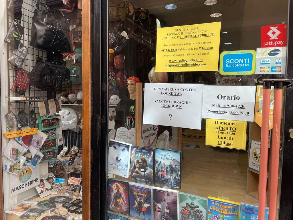 C’è chi ha esposto cartelli amareggiati contro il Governo, sottolineando che tra Conte e Draghi non è cambiato nulla, chi commenta ad alta voce che il virus e l’Agenzia delle Entrate hanno lo stesso tasso di mortalità, chi, come il proprietario del Budego, celebre focacceria in via Cavour, lascia da parte le battute taglienti e scrive solo un enorme Covid-19, perché forse non c’è davvero più niente da dire.