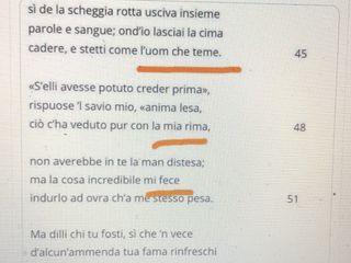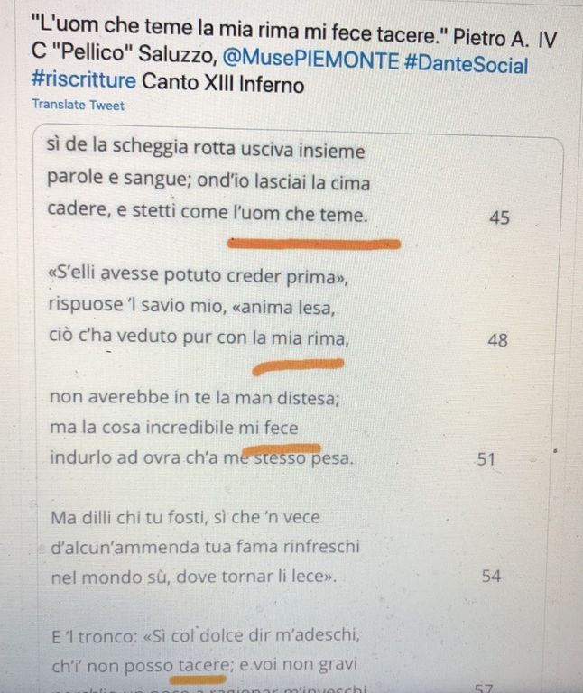 La classe, inoltre, ha partecipato a un piccolo “esperimento” di riscrittura poetica con la professoressa Manuela Bosio, passando attraverso la sottolineatura del testo originale della “Commedia”, per creare versi nuovi e spesso sorprendenti..
