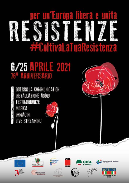Dal 6 al 25 aprile per Cuneo e sulle pagine social di Resistenze (facebook, instagram, twitter): guerrilla communication, installazione audio, testimonianze, musica, immagini e live streaming per raccontare la lotta partigiana nata nelle nostre valli e riscoprire i luoghi più significativi della Resistenza della nostra città, il tutto con uno sguardo rivolto all’Europa. Nell’ottantesimo anniversario dalla pubblicazione del “Manifesto di Ventotene”, partiremo da quegli ideali di libertà, pace e unità che hanno ispirato la nascita dell’Europa per scongiurare altri conflitti nel nostro continente.