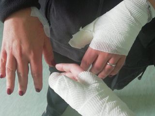 Nel collage la bassottina Luna, le ferite riportate da mamma e figlia e i due cani che le hanno aggredite