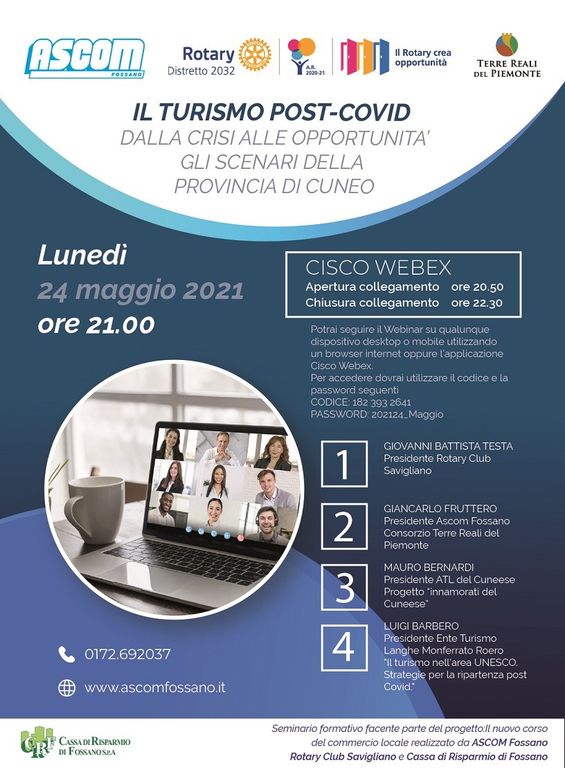 Nella serata di Lunedì 24 Maggio si è tenuto un seminario formativo dal titolo “Il turismo post Covid – dalla crisi alle opportunità, gli scenari della provincia di Cuneo”.